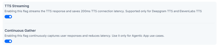 This option appears when enabling TTS Streaming. Enable this option to capture user responses and reduce latency. Use it only for Agentic App use cases.