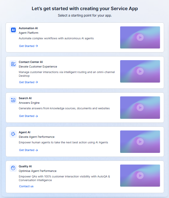 Select the type of app you want to create. The available apps are AI Agents (Automation AI), Contact Center AI, Search AI, and Agent AI.