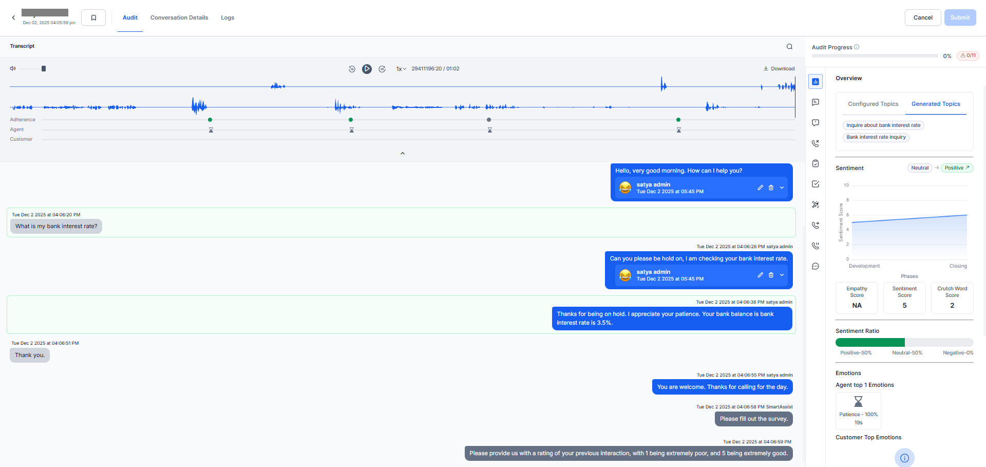 This section displays all feedback provided by auditors during the evaluation process. It provides a comprehensive list of auditor-submitted notes for each interaction. All the submitted comments appear both in the Conversation Transcript and in the Comments tab, with commenter details shown based on privacy settings (For example, Hide Auditor Details).