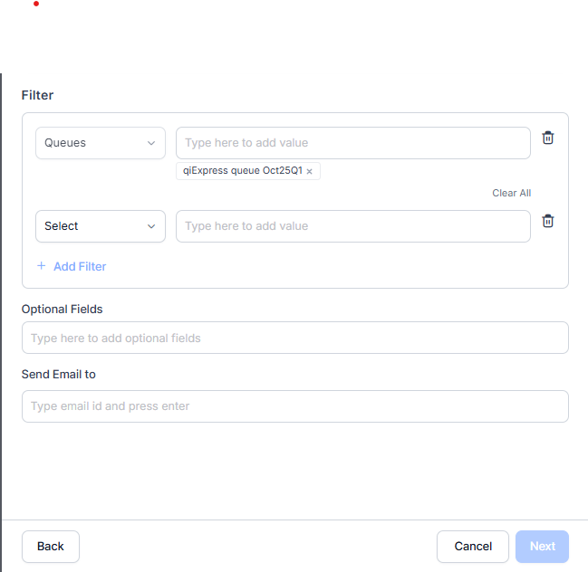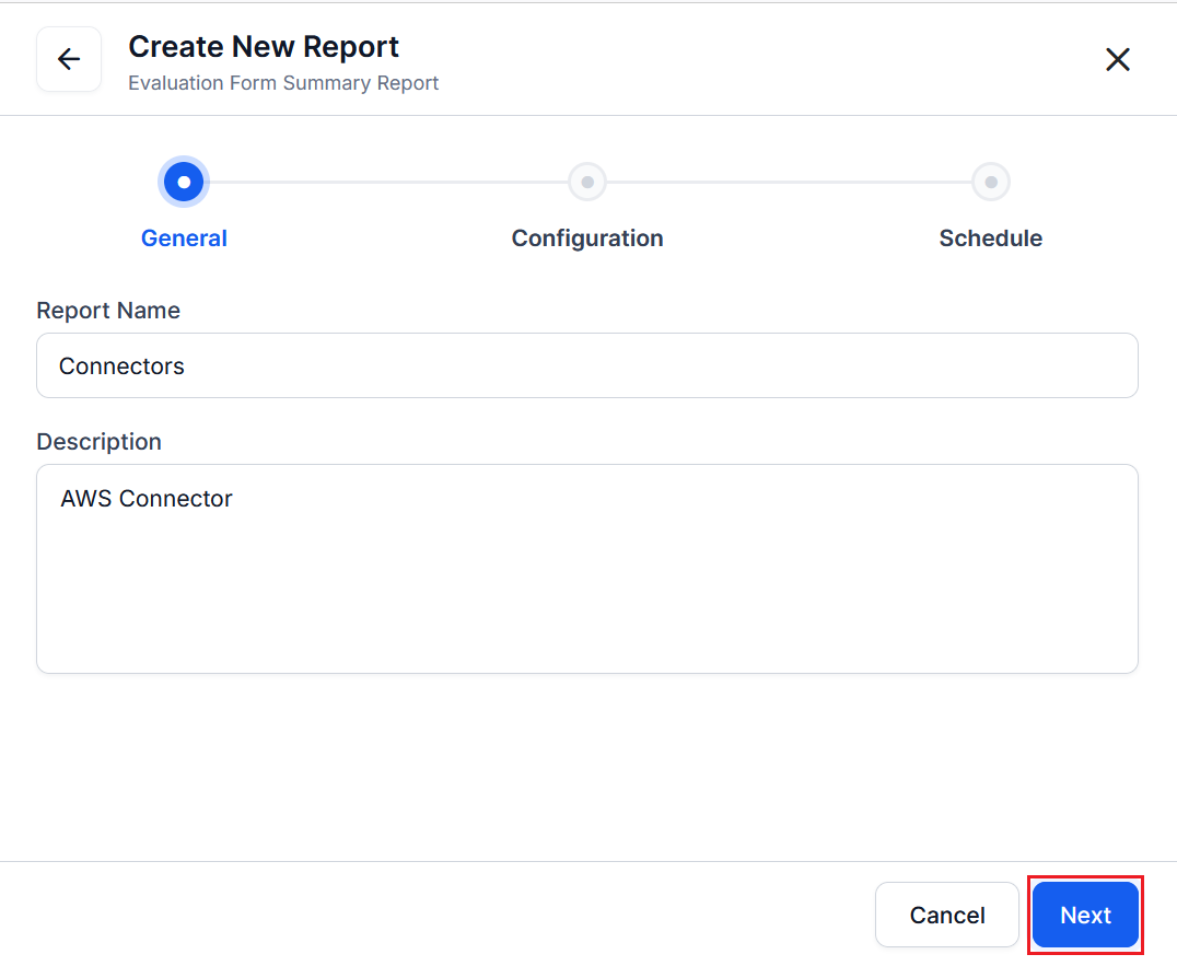 • Report Type: Shows Evaluation Form/Interaction Evaluation/Agent Performance (for example, Evaluation Form, Interaction Evaluation, Agent Performance) to show what data or metrics the report covers.