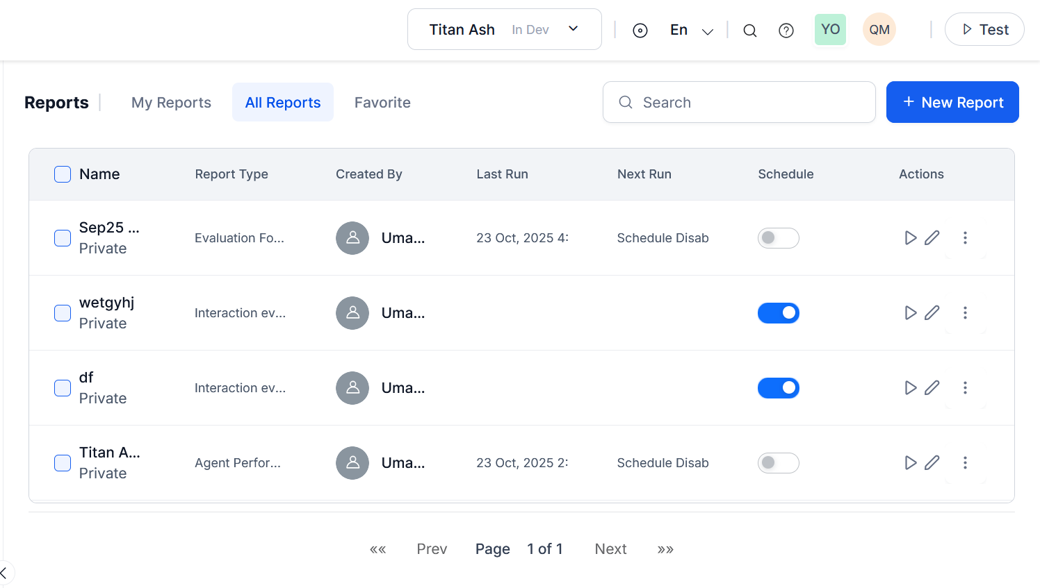 The Quality AI scheduled reporting feature provides comprehensive data export capabilities, including scheduling, execution, and bulk operation management for AutoQA and Conversation Intelligence insights. This enables QA Managers, Supervisors, and authorized users to generate, schedule, and download detailed reports that cover interaction details, agent performance metrics, and evaluation metric adherence across configurable time periods and organizational filters.