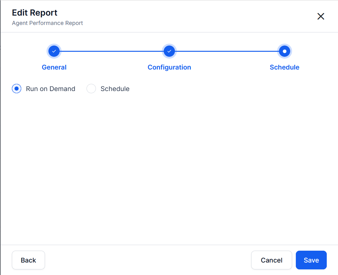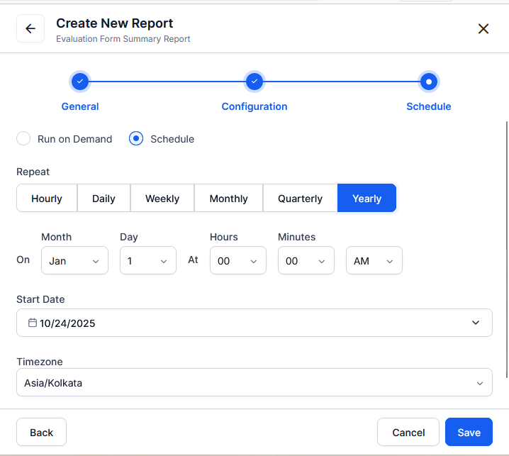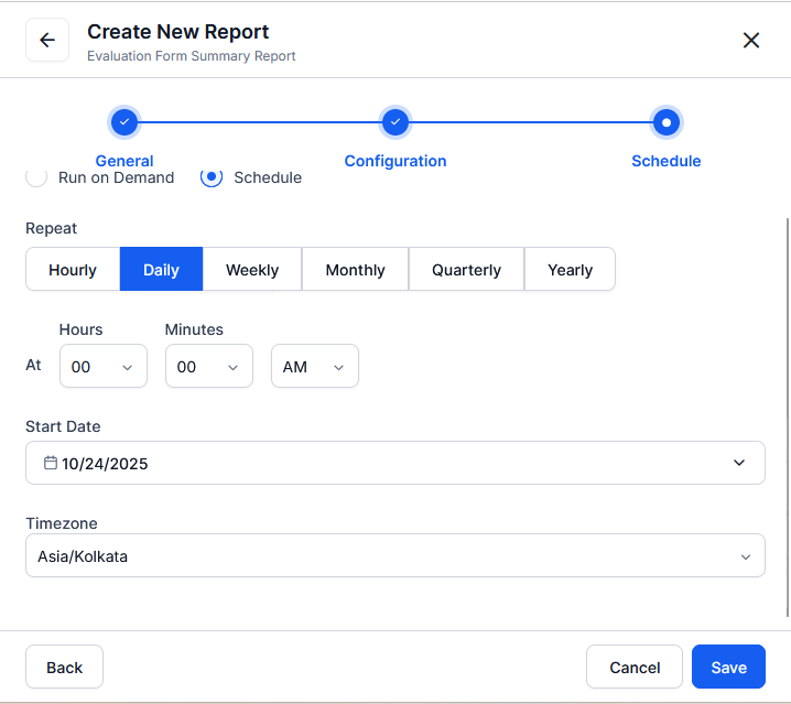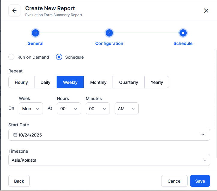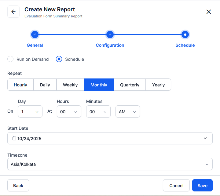 • Schedule: Select this to automate recurring report generation and delivery based on the chosen frequency and settings.