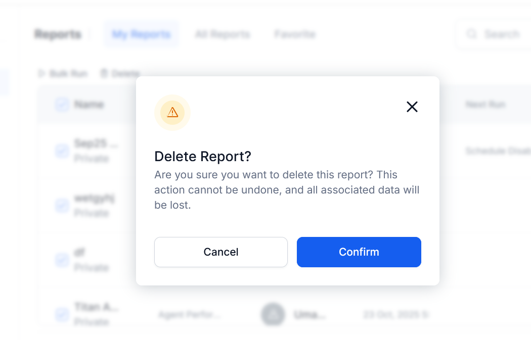 • Bulk Delete: Removes all selected reports (requires confirmation).