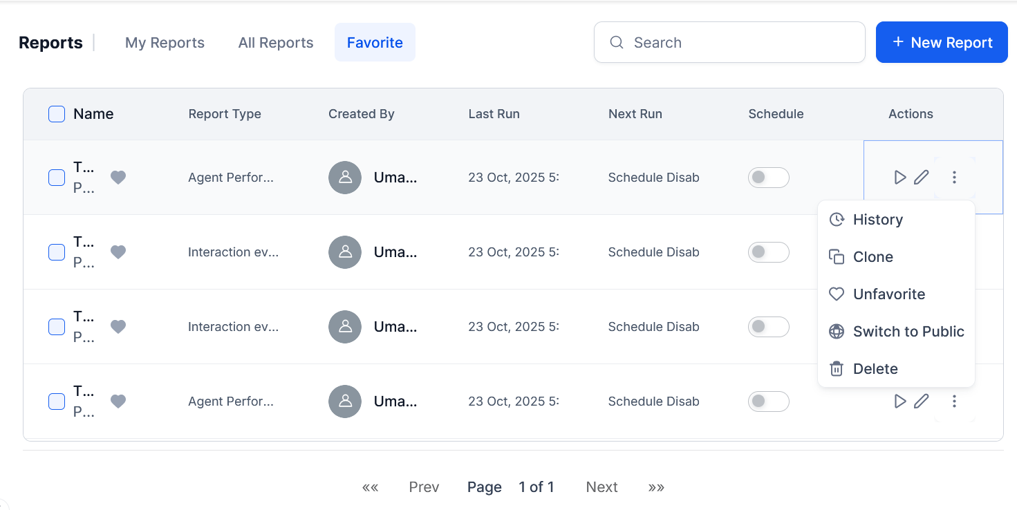 • Favorite: Filtered view displaying only reports marked as favorites by the user.