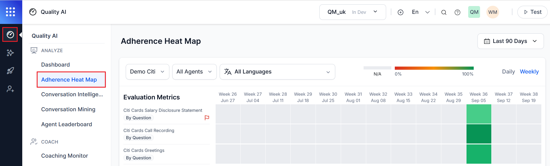 Navigate to Quality AI > ANALYZE > Adherence Heatmap.