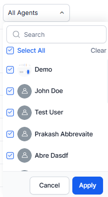 By default, all agents in the selected queues get displayed. In this, all agents under the queues that the selected form is assigned to are displayed. You can search for and multi-select agents by name and apply filters accordingly. When the agent filters are applied, the adherence heatmap is recalculated for the selected agents within the selected queue. This displays the adherence data only for the selected agents and their completed interactions.