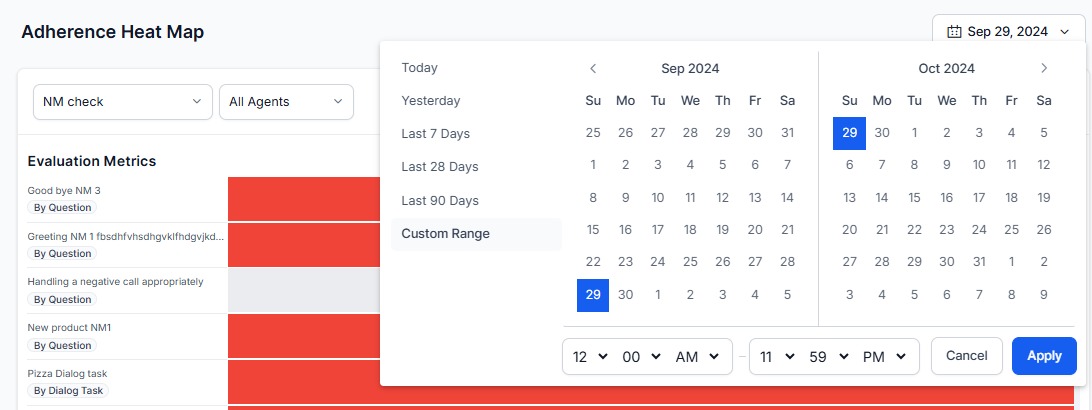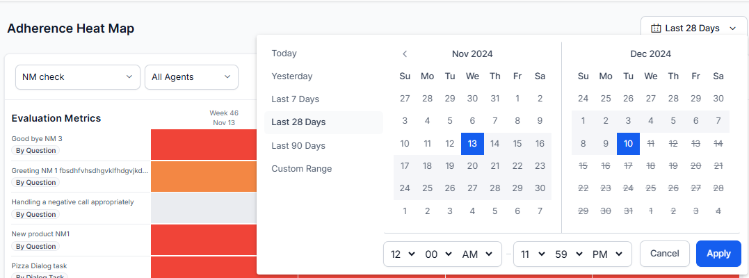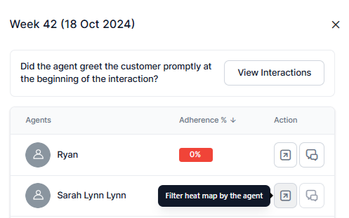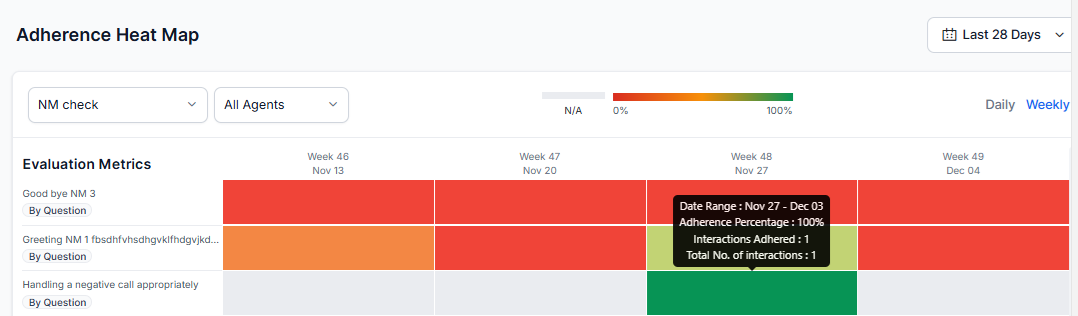 Heatmap Interaction: Click a date range tile (box) in the heatmap to open a window that displays agent-wise adherence percentage for the selected metric, ordered from least to most adherence. This displays the percentage count of adherence interactions.