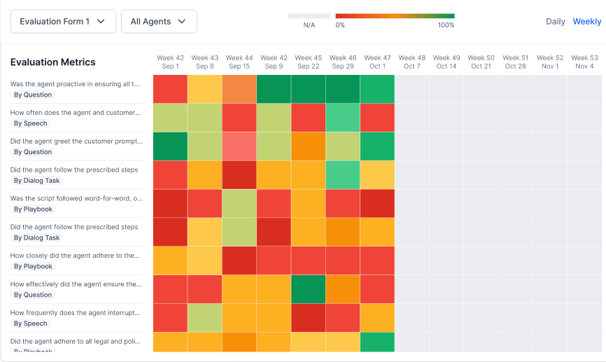 Supervisors Agents can use flagged fatal errors to self-assess and prepare for coaching. Visual adherence scores (heat maps) and question-level feedback support this process. For more information, refer to AI-Assisted Manual Audit.