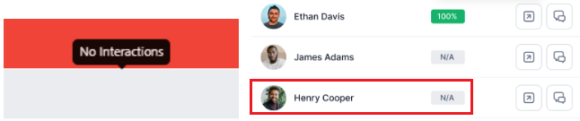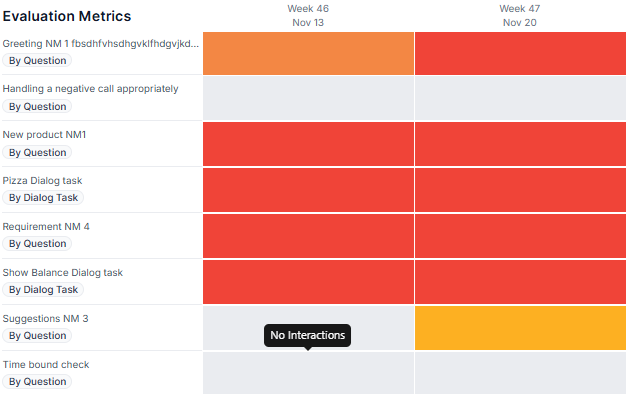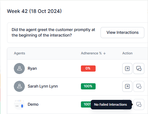 Displays No Interactions for N/A cases and No Failed Interactions for agents with 100% adherence. The View Interactions button gets disabled for agents with no applicable interactions or those with 100% adherence.