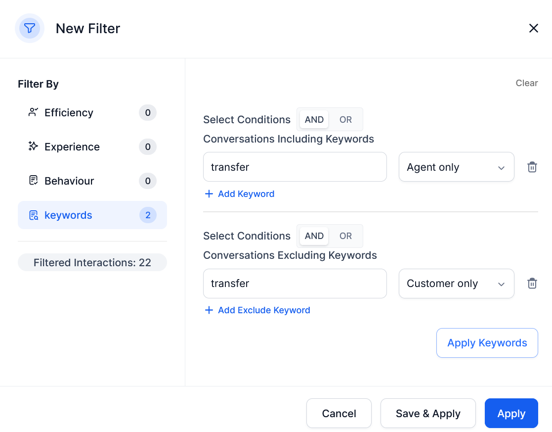 | Filtered Keywords Interactions | The system displays the count of filtered interactions that contain the selected keywords after applying the filters (for example, "Filtered Interactions: 22"). |