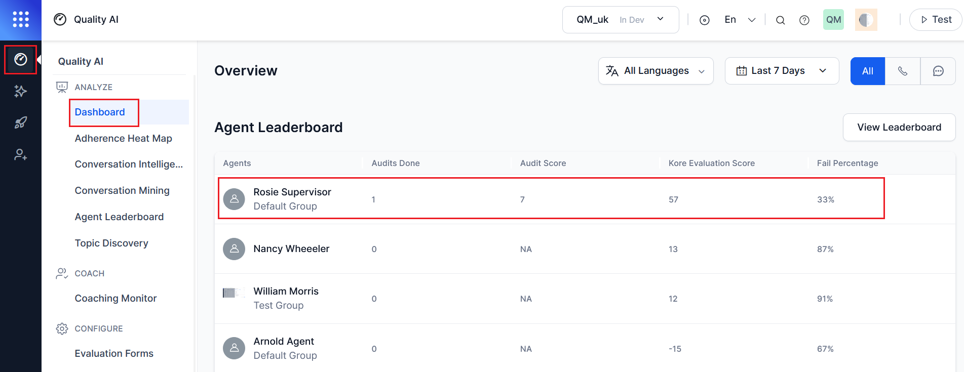 The View Leaderboard option allows supervisors, auditors, and managers to see both top and bottom-performing agents, along with their conversations. For more information, see Agent Leaderboard.