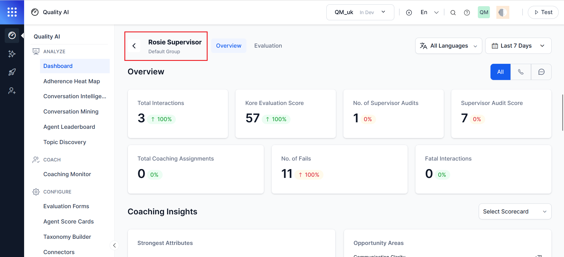 Supervisors can also review language-specific agent interactions and evaluation details to support targeted coaching.