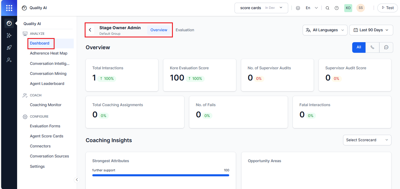 This functionality supports multilingual performance monitoring, enabling supervisors to compare agent performance across languages and generate better coaching insights. Each scorecard supports independent language settings, separate from the global dashboard language. This enables flexible multilingual configuration across the platform.