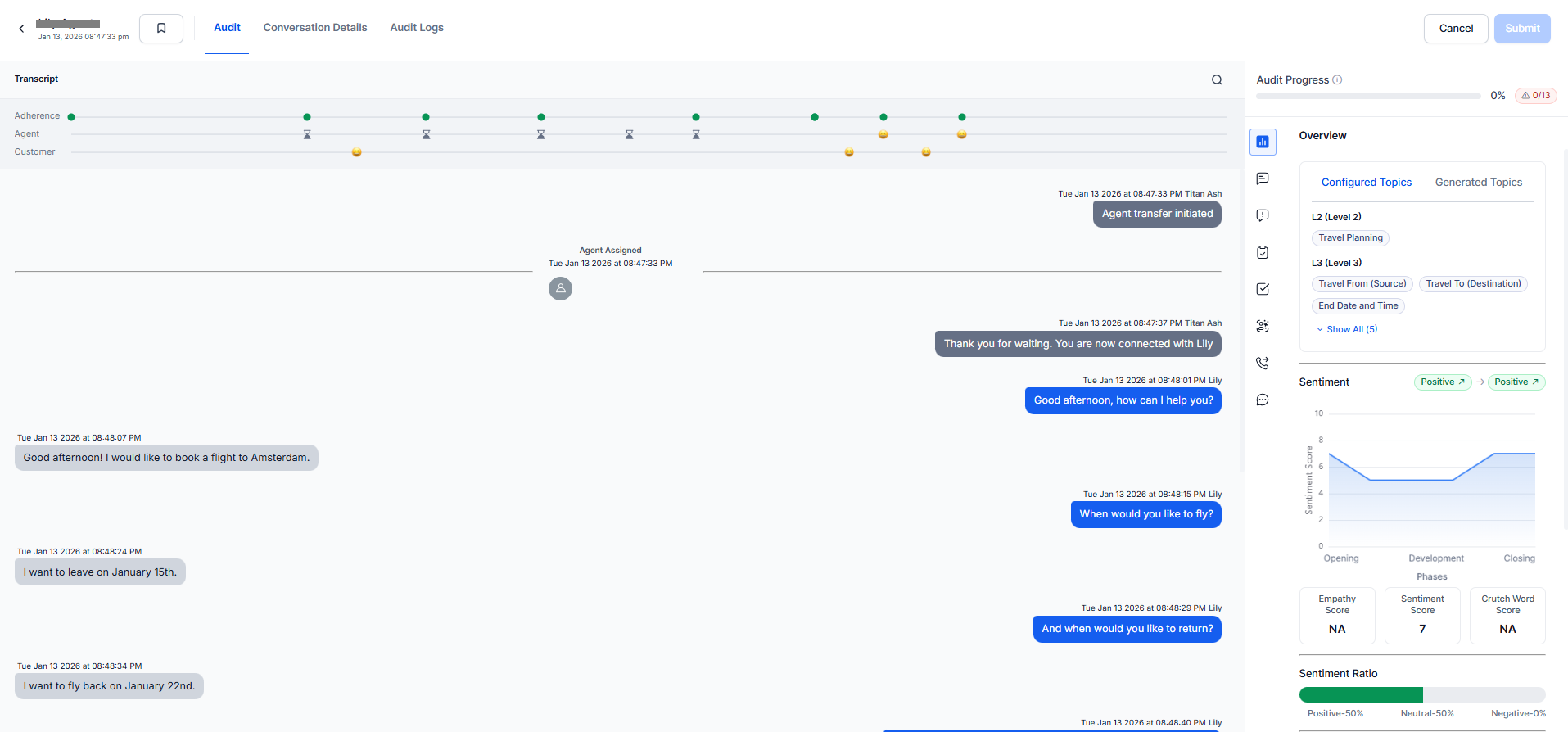 | Sentiment Score | Overall sentiment analysis of the customer's experience (positive, negative, neutral, with numerical scoring). |