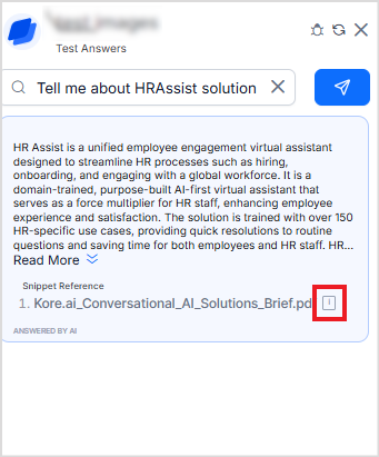 7. Test the answers. Go to the Answer Generation page and use the Test Answer widget to verify the results. When queries are made against indexed images, the text extracted from the image appears as part of the generated answer. The complete image can be viewed by clicking the Preview icon next to the references.